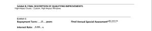 QUALIFYING IMPROVEMENTS FOR ENERGY EFFICIENCY, RENEWABLE ENERGY, OR WIND RESISTANCE. – The property being purchased is located within the jurisdiction of a local government that has placed an assessment on the property pursuant to s. 163.08, Florida Statutes. The assessment is for a qualifying improvement to the property relating to energy efficiency, renewable energy, or wind resistance, and is not based on the value of the property. You are encouraged to contact the county property appraiser’s office to learn more about this and other assessments that may be provided by law.